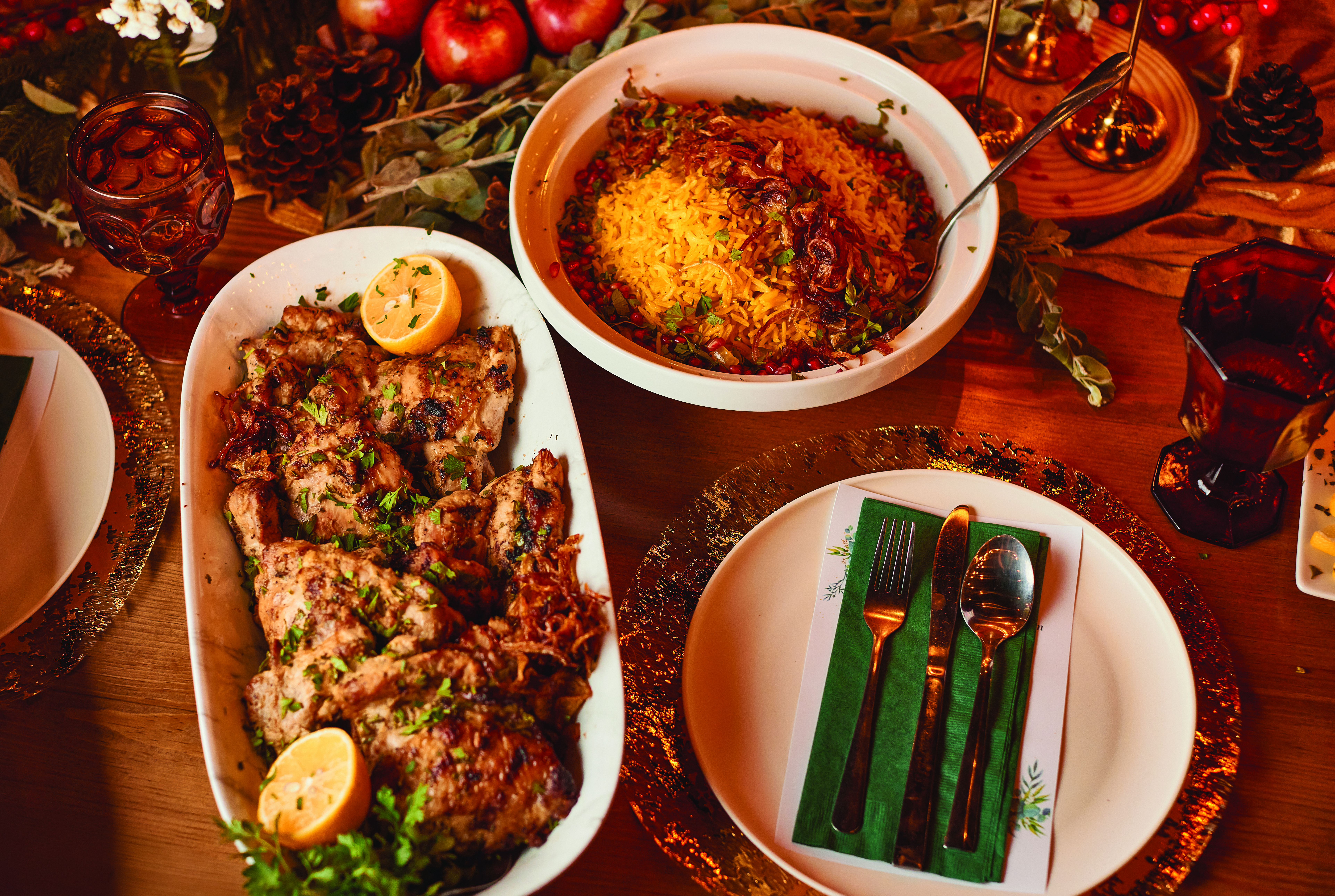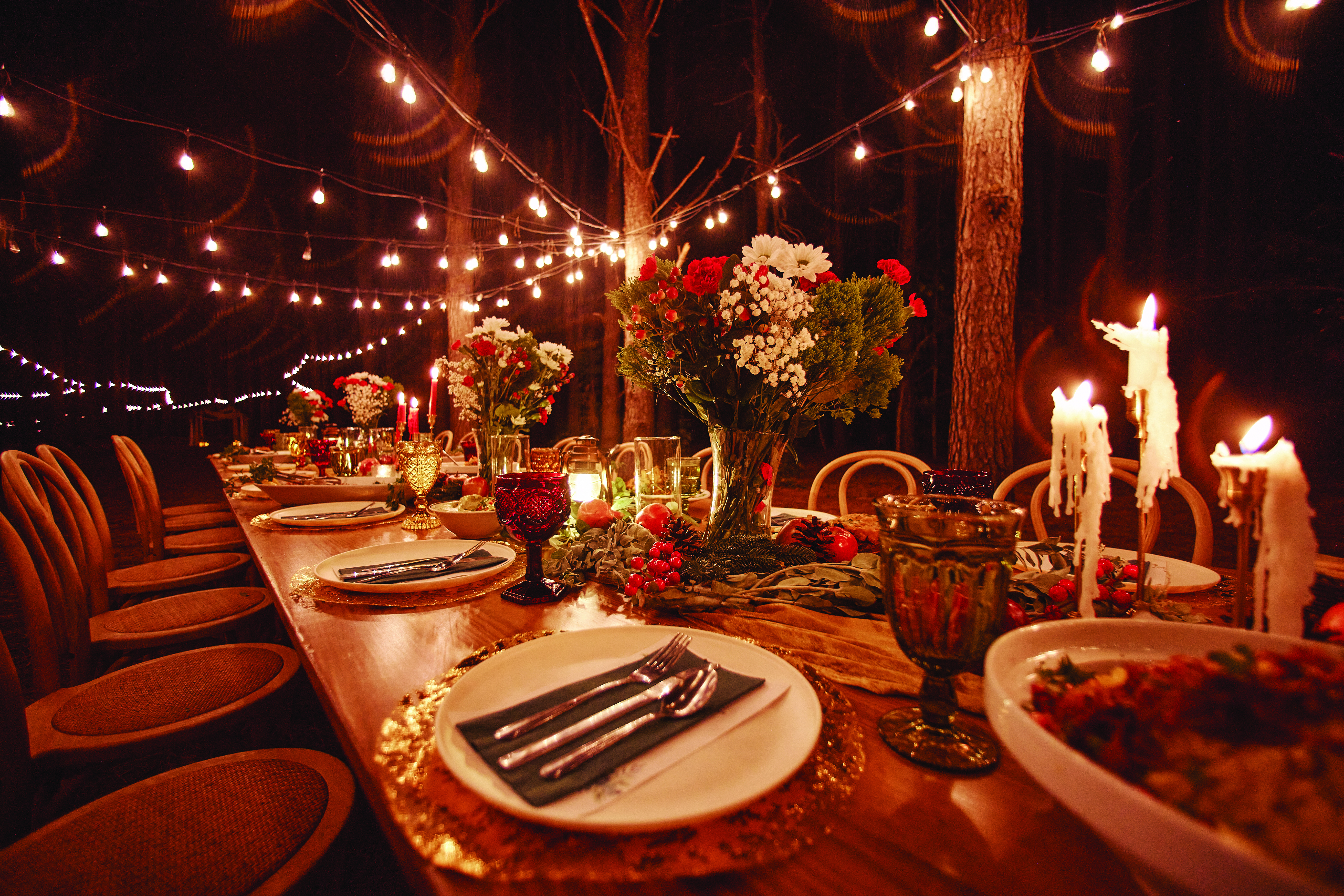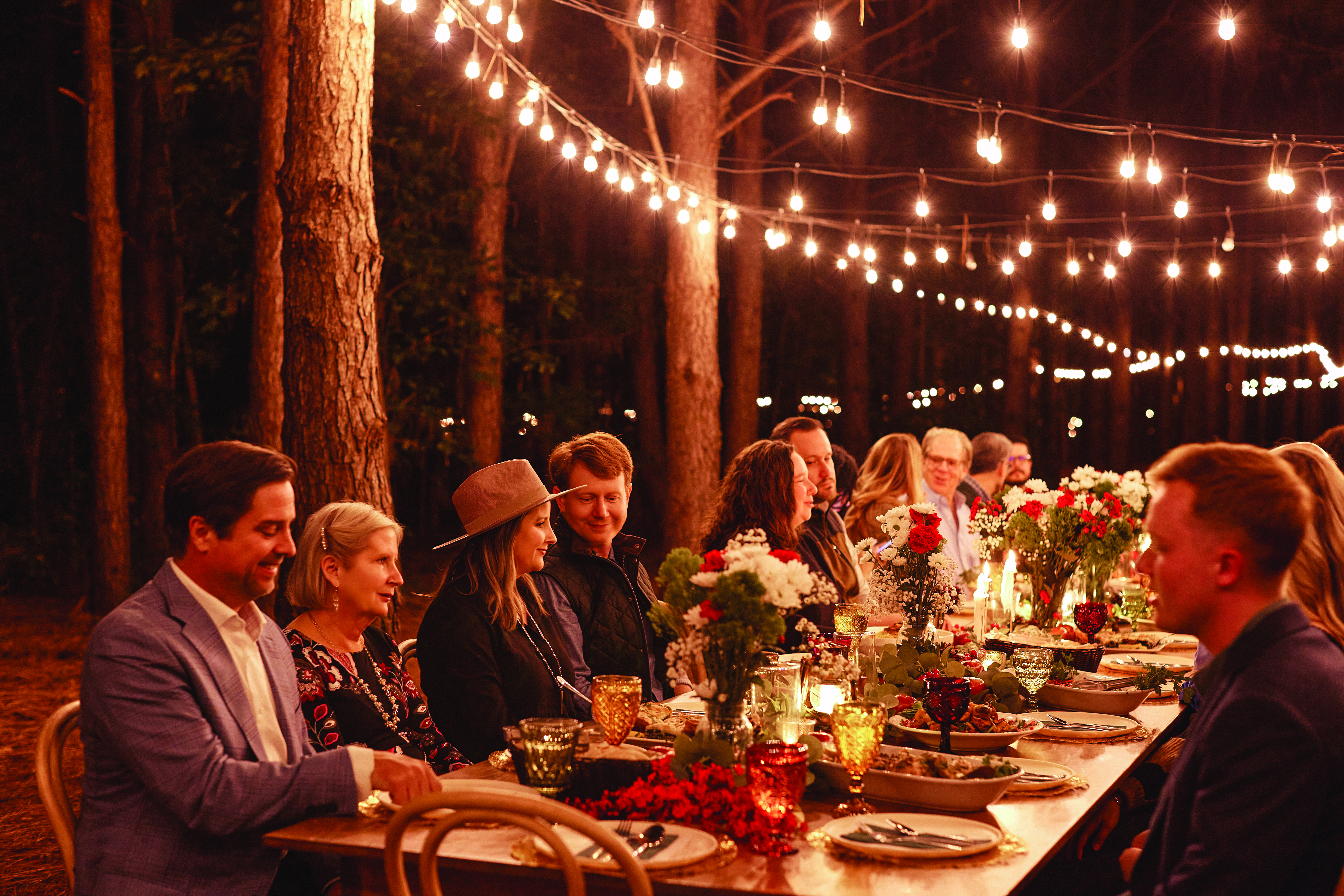 As you leave the pavilion and follow the path into the trees, the world shifts. The faint rumble of traffic nearby fades away, replaced by the quiet footsteps on gravel, murmurs of conversation, and the glow of lights strung high above. Ahead, a long table awaits, glowing with candles, scattered with pomegranates and apples, and dressed for a spectacular feast. “This was always the vision. Guests would come out here during the day and think backyard barbecue. But I knew it could be more—something elevated, something magical,” Simone says. Sitting at that long table, with strangers on either side quickly becoming friends, feels like stepping into another world. Every seat encourages conversation, every detail invites lingering, and every guest becomes part of the story.