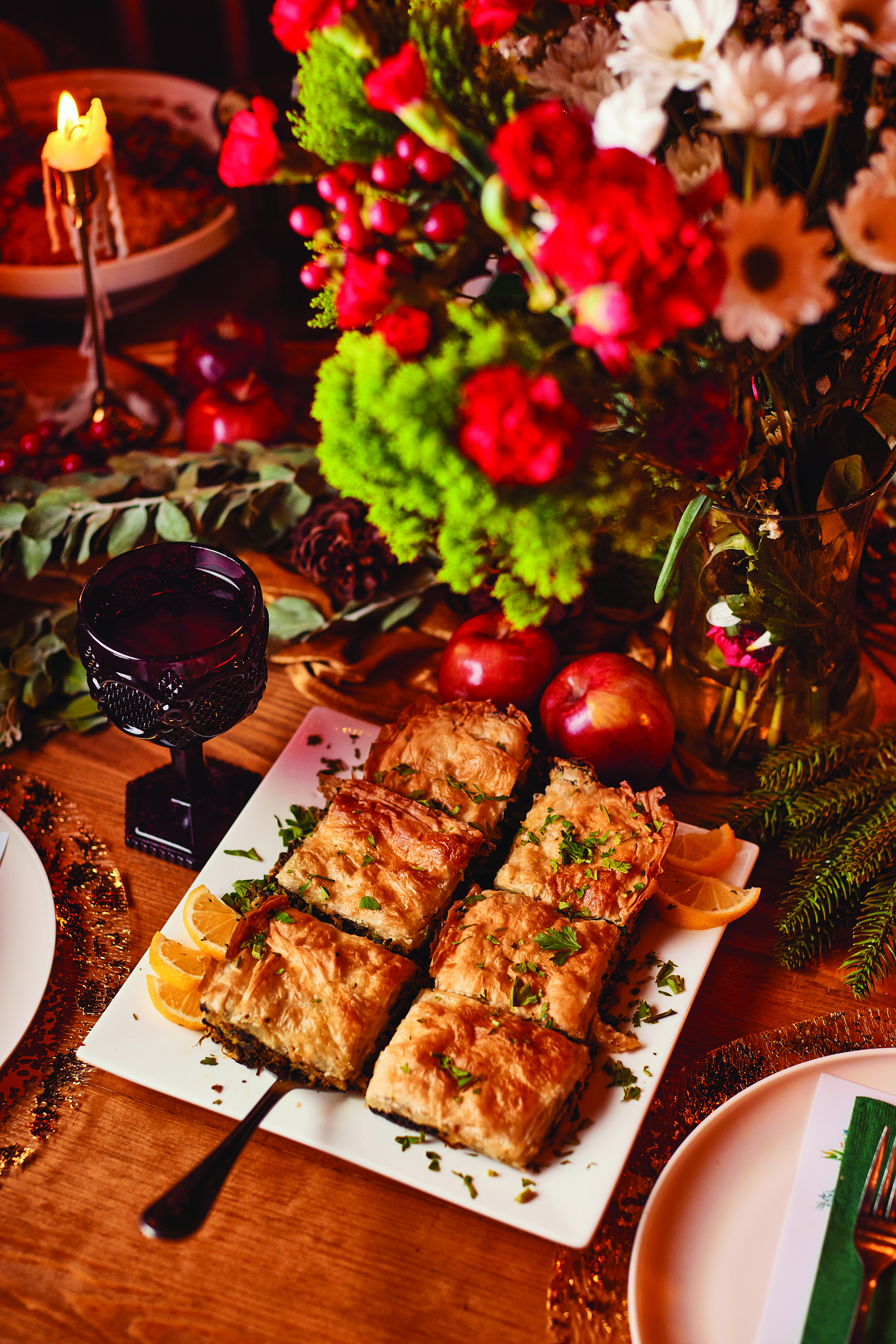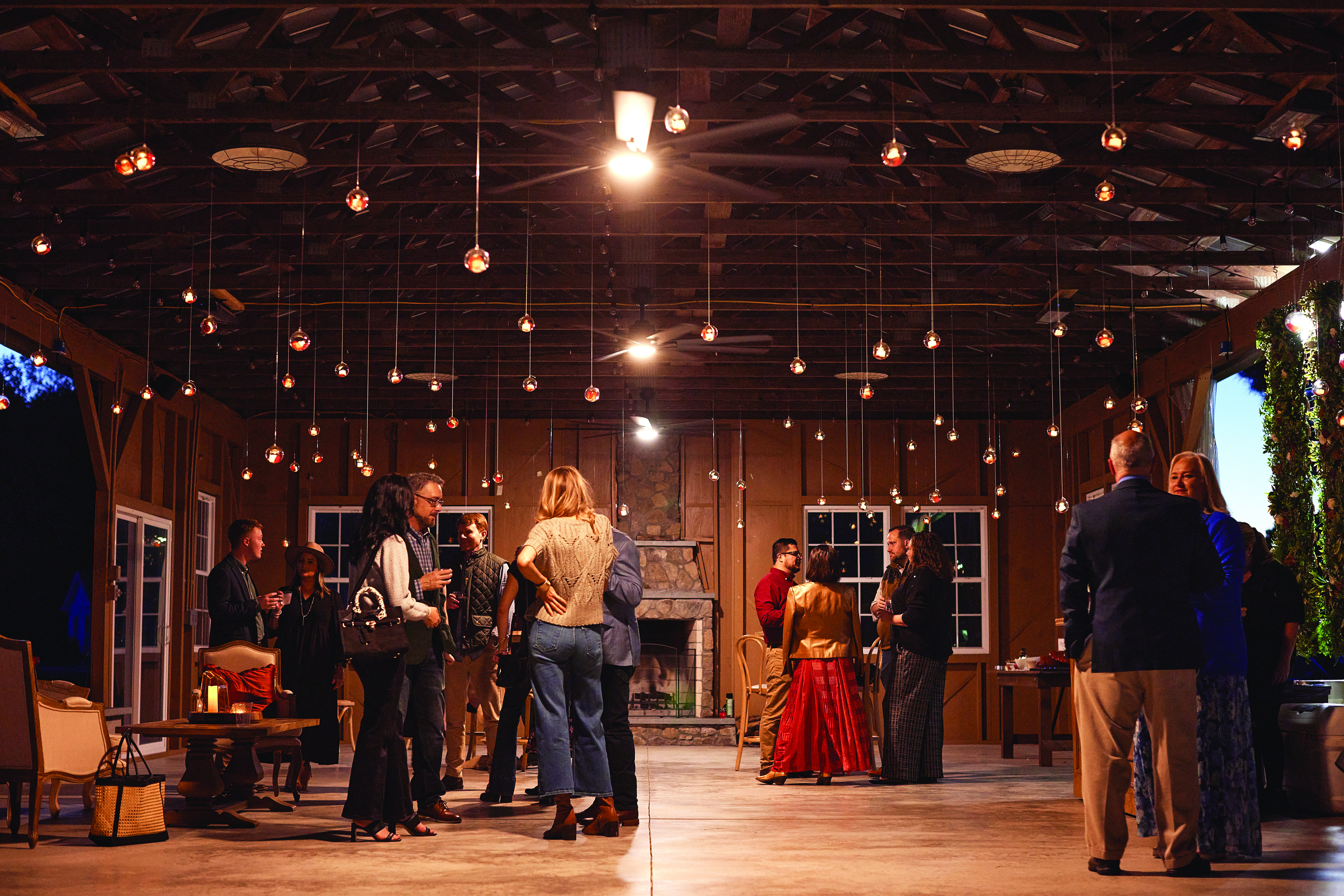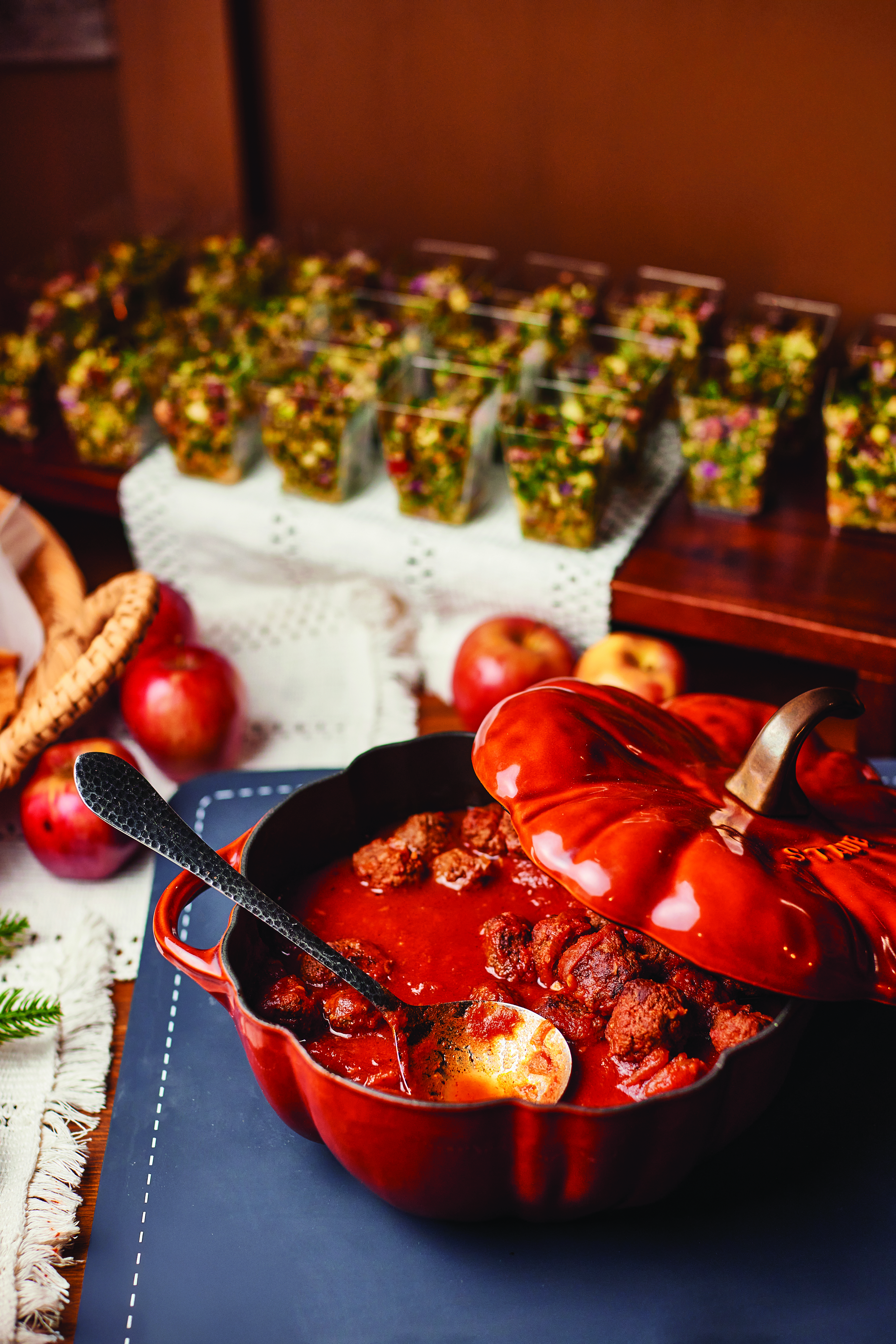 As you leave the pavilion and follow the path into the trees, the world shifts. The faint rumble of traffic nearby fades away, replaced by the quiet footsteps on gravel, murmurs of conversation, and the glow of lights strung high above. Ahead, a long table awaits, glowing with candles, scattered with pomegranates and apples, and dressed for a spectacular feast. “This was always the vision. Guests would come out here during the day and think backyard barbecue. But I knew it could be more—something elevated, something magical,” Simone says. Sitting at that long table, with strangers on either side quickly becoming friends, feels like stepping into another world. Every seat encourages conversation, every detail invites lingering, and every guest becomes part of the story.